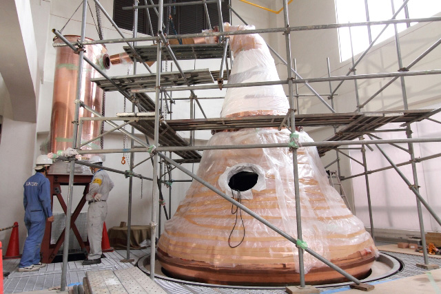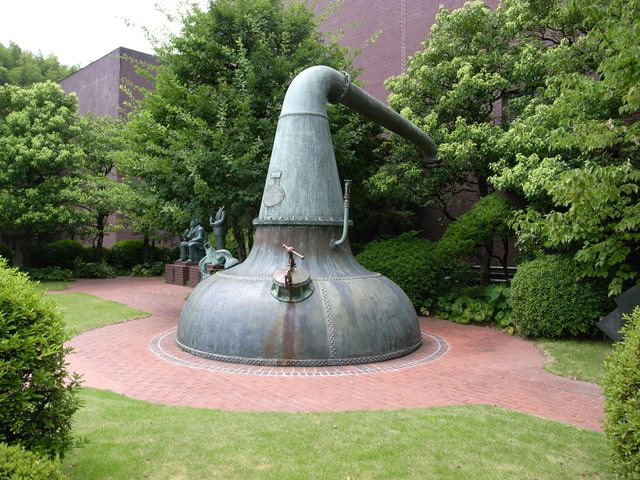 工場ガイドツアーが始まったら、工場に入る前の庭に鳥井信治郎像と並んで置かれたポットスチルに注目してください。これこそ竣工当初のウイスキー蒸溜釜です。