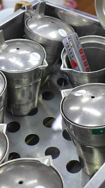 ・審査温度まで湯煎し、審査番号の入ったきき猪口に注ぎ入れて審査テーブルへ