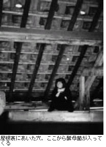 二階には煮沸釜があって、大麦麦芽を主に小麦とホップを加えて煮沸する。このホップは三年もわざわざ寝かせておいたものだそうです。出来た麦汁は屋根裏部屋にある、上部が開放された冷却槽にポンプアップされ、一晩放置されます。この屋根の裏側を見上げてビックリしました。小さな穴が沢山あいているのです。もっとも雨が降り込まないように工夫はされていますが。つまり外からの空気が自由に入ってくるわけですね。ここで麦汁が冷却されるうちに、空気中に漂っている酵母菌を取り込むというのですが、一緒に雑菌も入ってしまうはずです。