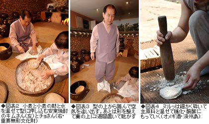 慶尚北道の安東(アンドン)焼酎を訪ねると、実際にヌルッづくりを見せていただくことができました(図表2・3)。粗く引いた小麦と小麦の麩に水を加えてよく混ぜ合わせます。適度な硬さを得たところで、布に包んで型に押し込みます。さらに上から足踏みして中の空気を追い出し、布から取り出して藁の上に置いて二週間前後乾燥させるというものでした。日本では麹をつくるのに穀物を加熱しますが、安東焼酎で見た麹は一切加熱せず、生のままで麹菌を繁殖させていました。