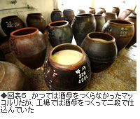 また、二東酒造のマッコルリづくりは酒母をつくり、蒸米と水を掛ける仕込み方法が採用されていました。この点も酒母をつくらずに一度に仕込む家庭でのマッコルリづくりと異なる点です(図表6)。