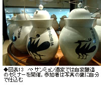 伝統酒博物館には、時代ごとの酒づくりの整理、韓国の家々で酒づくりの道具を展示、各工程のジオラマによる再現、酒づくりの機械化の進行などが展示されていました。そしてもっとも感心したのは「酒文化セミナー」を定期的に開催していることでした。三〇人ほど入るセミナールームで、家醸酒セミナーや酒器づくりセミナーを開催しています。副支配人のチョン・チャンミンさんは「韓国では家庭での酒づくりが盛んでしたから、自分でお酒をつくるセミナーは今、やっておくべきだと考えています」と言います(図表13)。ちなみにチョンさんは日本の大学の医学部で一一年も乳酸菌の研究をしていたそうで、きれいな日本語で対応くださいました。