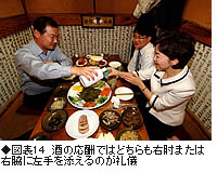 こうした作法はソウル市内の飲食店や酒場を見る限り、かなり薄まっているようでした。酒をやり取りする時に、注ぐ側も受ける側も右肘もしくは右脇に左手を添えるスタイルは健在でしたが、目上の人の前で体を横に向けて飲むことはあまり見かけません(図表14)。ただし、この作法も少しフォーマルな場では当たり前におこなわれているとのことです。今回取材をコーディネートしてくれたイ・キョンアさんは、「私もあらたまった感じの席では、意識しなくとも自然に体を捻ってしまうんですよ。友だちもほとんどそうだと思います」と言います。イさんはソウルに住む二〇代の女性です。