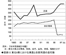 八八四年は全国でおよそ五三万石で、清酒・濁酒全体の一五%を占めていた。自家醸造が盛んだった東北六県では、一九世紀末頃は常に二〇万石ほどあり、酒造業者の製造石数の七割近いボリュームとなっていた(図表12)。