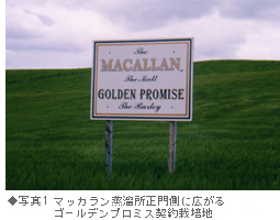 なだらかな丘陵を埋め尽くす大麦畑のなかにマッカラン蒸溜所はひっそりと建つ。入り口では「マッカラン ゴールデンプロミス(Golden Promise)」(写真1)と書かれたボードが目を惹く。ロゴがくっきりと浮かび上がるそれは、同社の原料へのこだわりを誇らしげに示すものだ。