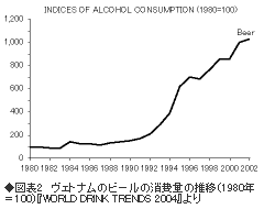 ニャーさんの話のとおりヴェトナムのビール消費量は、一九九二年を転機として急増しています(図表2)。一〇年後の二〇〇二年に発行された観光ガイドブックには、「ヴェトナムの庶民の味はビアホイ」という紹介があり、ホテルや高級レストランではビールが冷やして出されるが、路上ではジョッキに氷を入れて飲むビアホイが一〇分の一の値段で売られているといいます。何やらビール急増と深く関係していそうな記述です。