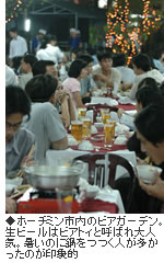 日本からホーチミン市に着いたその晩、さっそくビアホイ探検に繰り出しました。けれども結果は空振り。ガイドさんから「ホーチミン市内はほとんど生ビールに変わりました。ビアホイはありません」と言われ、日曜日の晩にもかかわらず賑わっているビアトィ(生ビールの意)酒場に入ります。家族連れや男性のグループ客が目立ち、暑いのにあちこちでフウフウ言いながら鍋料理をつついています。ビールの味もなかなか。海外の巨大メーカーが直接・間接に進出し、技術レベルがアップ、品質の向上が著しいと言います。