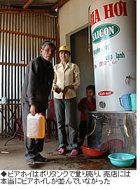 ホーチミンでは見ることができなかったビアホイには、中部高原地帯の田舎町コンツムの郊外で遭遇しました。街道沿いの小さな集落に「BIA HOI」の大きな看板を見つけたのです。店の真中には不釣合いに大きなビールタンクが一本あり、しかも冷蔵されていました。お客さんはポリタンクを持参して必要なだけ買って帰ります。ビールがほんとうに灯油のように売買されているのです。