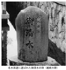 越前大野で特筆すべきは現在も上水道がないことだろう山々に囲まれた盆地で、大量の雪どけ水が地下で縦横に走る水脈となり、豊富な地下水が街のあちらこちらでこんこんと湧き出す。10mも掘れば日本名水百選に選ばれた清水(しょうず)と同じ水 が得られるため、各家庭が井戸をもち水道が要らないのである。その水を守り続けようとする住民意識が高まり、ようやく下水道の計画が持ち上がってきたところだ。