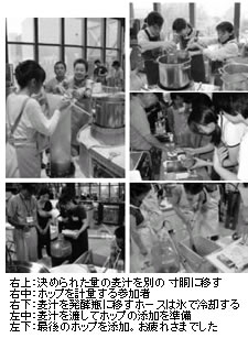 作業の切りのよいところで他のグループも交えて麦汁を味見しあったり、種類の異なるホップの香りを確かめるなどのイベントが入る。そして、麦汁を