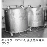 しかも、洗米ら蒸し米までの間、米は同じ浸漬蒸米(しんせきむしまい)兼用タンク(甑こしき)で過ごす。作業が進むにつれ、中身を移動させるのではなく、常にタンクごと移動させられるよう、底にキャスターの付いた特製のタンクが使われている。