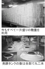 まず、仕込みに使うタンクは六トン仕込(二三キロリットル)二三本、三トン仕込(一二キロリットル)三〇本、一・五トン仕込(五キロリットル)一九本、七五〇キログラム仕込(二・五キロリットル)二〇本。
