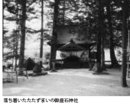祭りの舞台となる御座石(ございし)神社は、中央線茅野駅より東北へ約2キロ、八ケ岳山麓北山浦の入り口にあたる場所に鎮座している。この地域は、古くは矢ヶ崎村と呼ばれていたが、何回かの町村合併を経て昭和33年に茅野市となった。氏子たちの集住する神社周辺は本町地区と呼ばれ、市の中心地であり商店なども密集している。