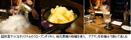 バーテンダーというよりも、ミクソロジストと言った方がしっくり来ます。液体窒素を使って超低温でつくる「フローズン松山ダイキリ」は、冷気の煙でカウンターが覆い尽くされるほどの迫力。見た目のおもしろさ