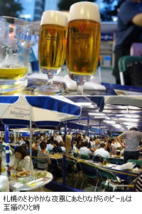 東京に比べて過ごしやすい気温に、やっぱり涼しいね〜と感激すると、地元の方は「それが最近は暑くなってクーラーを使う日もあるんだよ」と戻ってきました。中心部を貫く大通り公園で開催されるビアガーデンは、すっかり定着して札幌の夏の風物詩です。