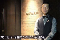 飲食店が並ぶ大通りから路地を入ると店の灯りが目に入り、中にはカウンターとボックス席が2席ありました。オーナーバーテンダーの武田海さんは、新潟市内のカク
