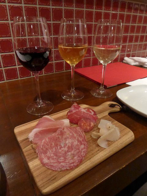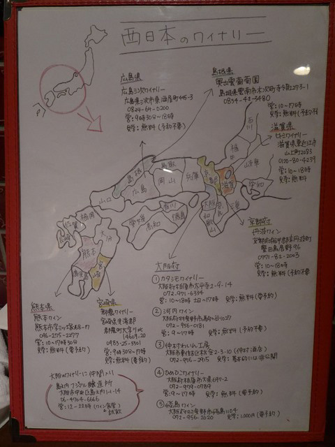 お邪魔すると平日というのにワイン食堂は予約で一杯です。予約のお客様がいらっしゃるまでの30分の約束でワインをいただくことにしました。自社栽培のブドウでつくったワインは、まだデラウェア種をシュールリー製法でつくった1種類だけ、他は同業者からブドウを分けてもらって仕込んだワインです。自社製造のワインがグラスで380円〜480円と格安なのは、瓶詰をしていないからだそう。ワインの貯酒タンクから必要な分を汲みだして提供しているので、瓶代やラベル代もかからず瓶詰作業そのものも省けるので、コストがぐっと下がります。