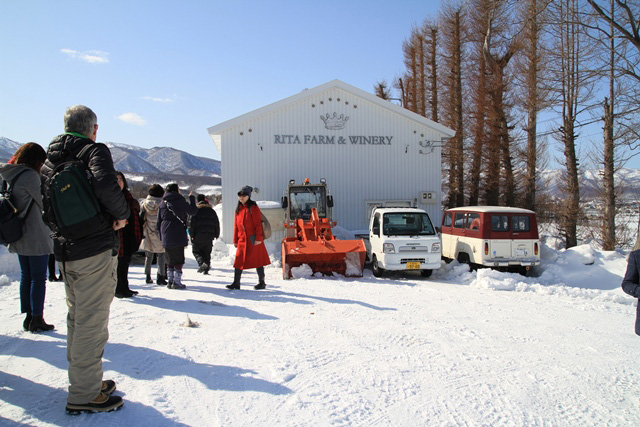 御前8時に札幌バスターミナルを出発し、小樽の北海道ワインセンターで休憩、30分ほど運河周辺を散策して、余市の登地区にあるリタファーム&ワイナリーに向かいます。10時半、近くまで来ると、「ここでバスを降りて雪道を歩いていただきます」とアナウンス。ワイナリーへの道は細く大型バスは入れません。参加者は青空の下で雪道を歩くことを大歓迎、見渡す限りの雪の原に歓声があがります。